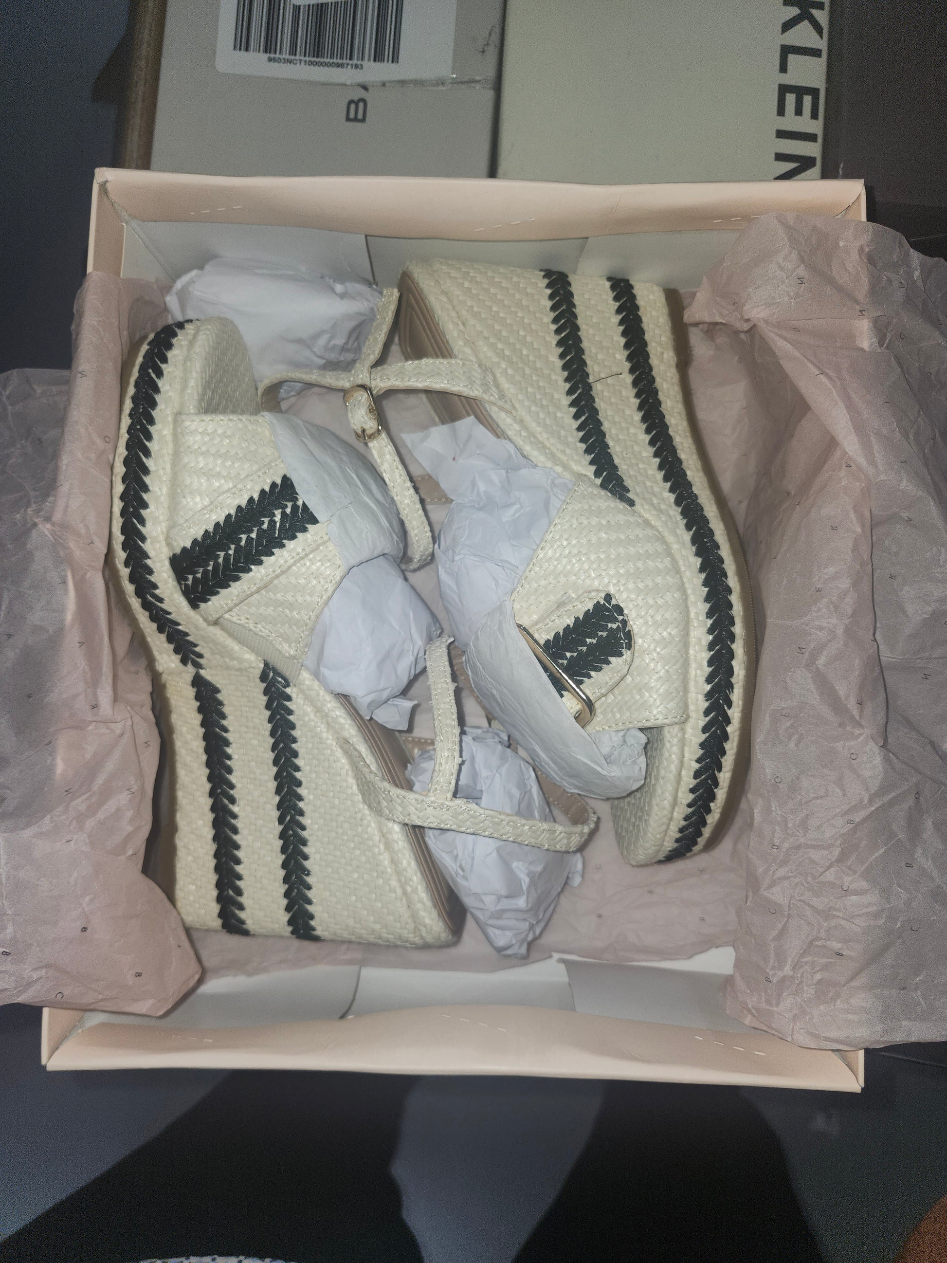 BCBGeneration Elo Buckle Wedge Sandals - Porcelain, Black Size 7US