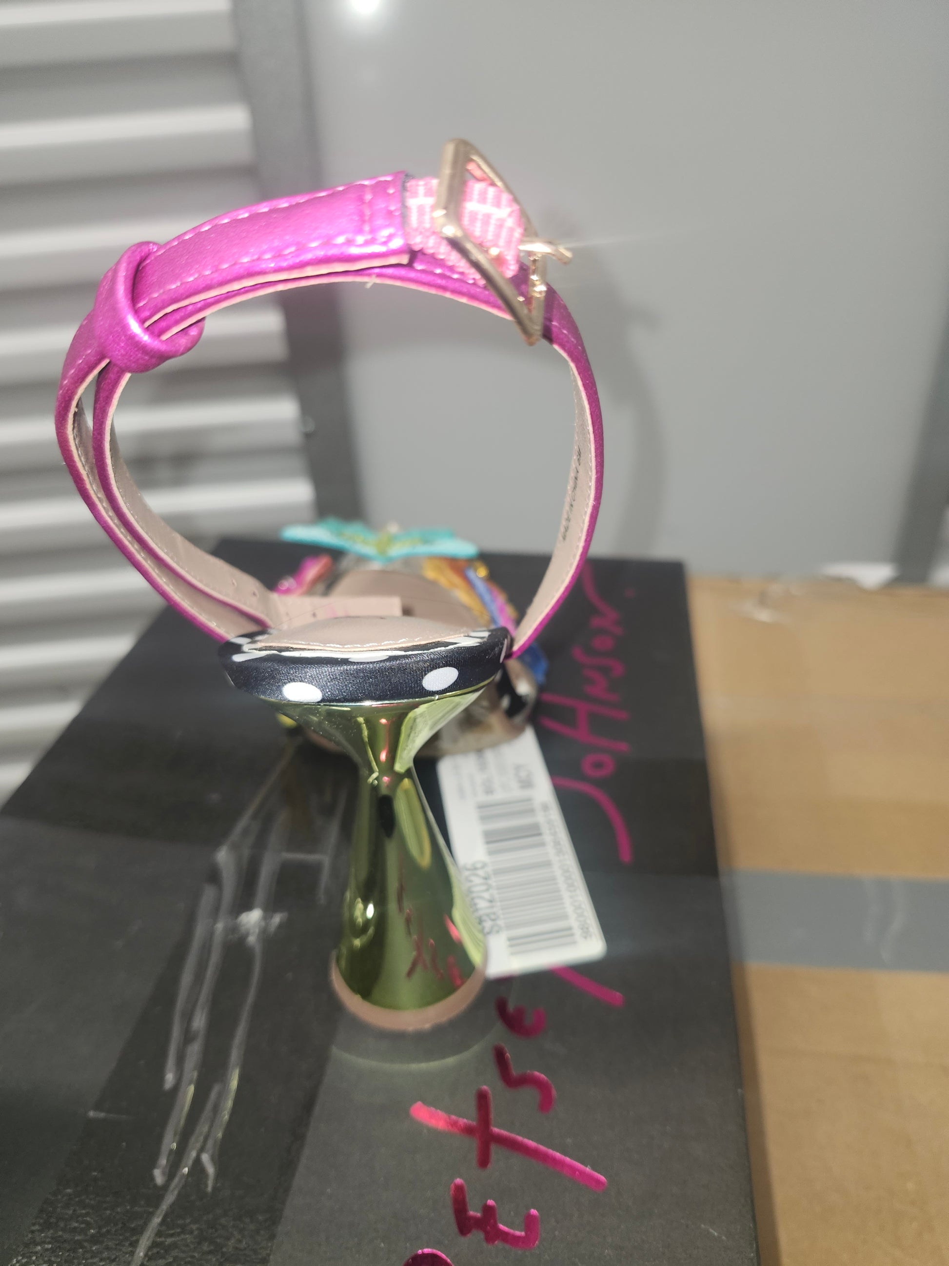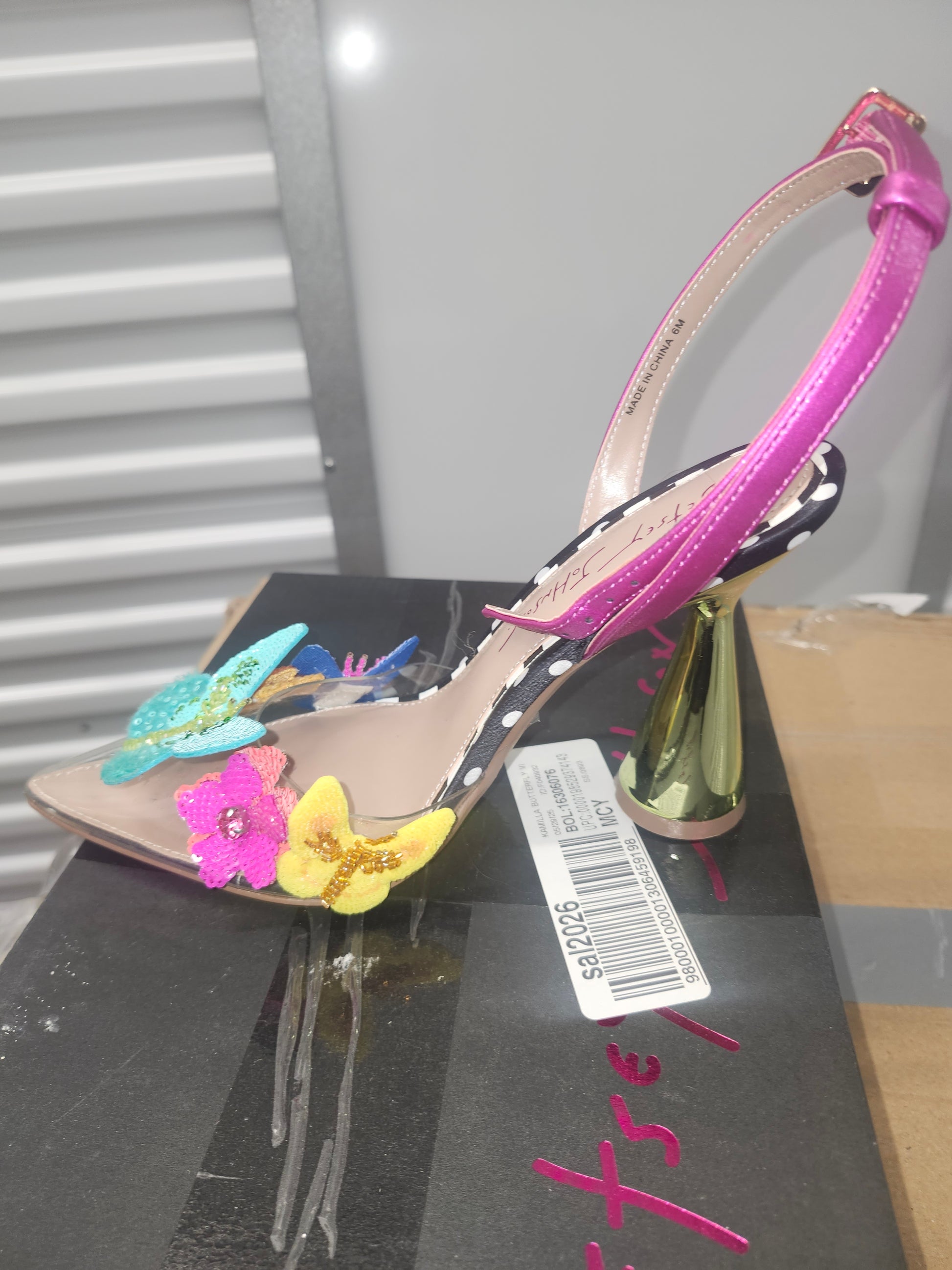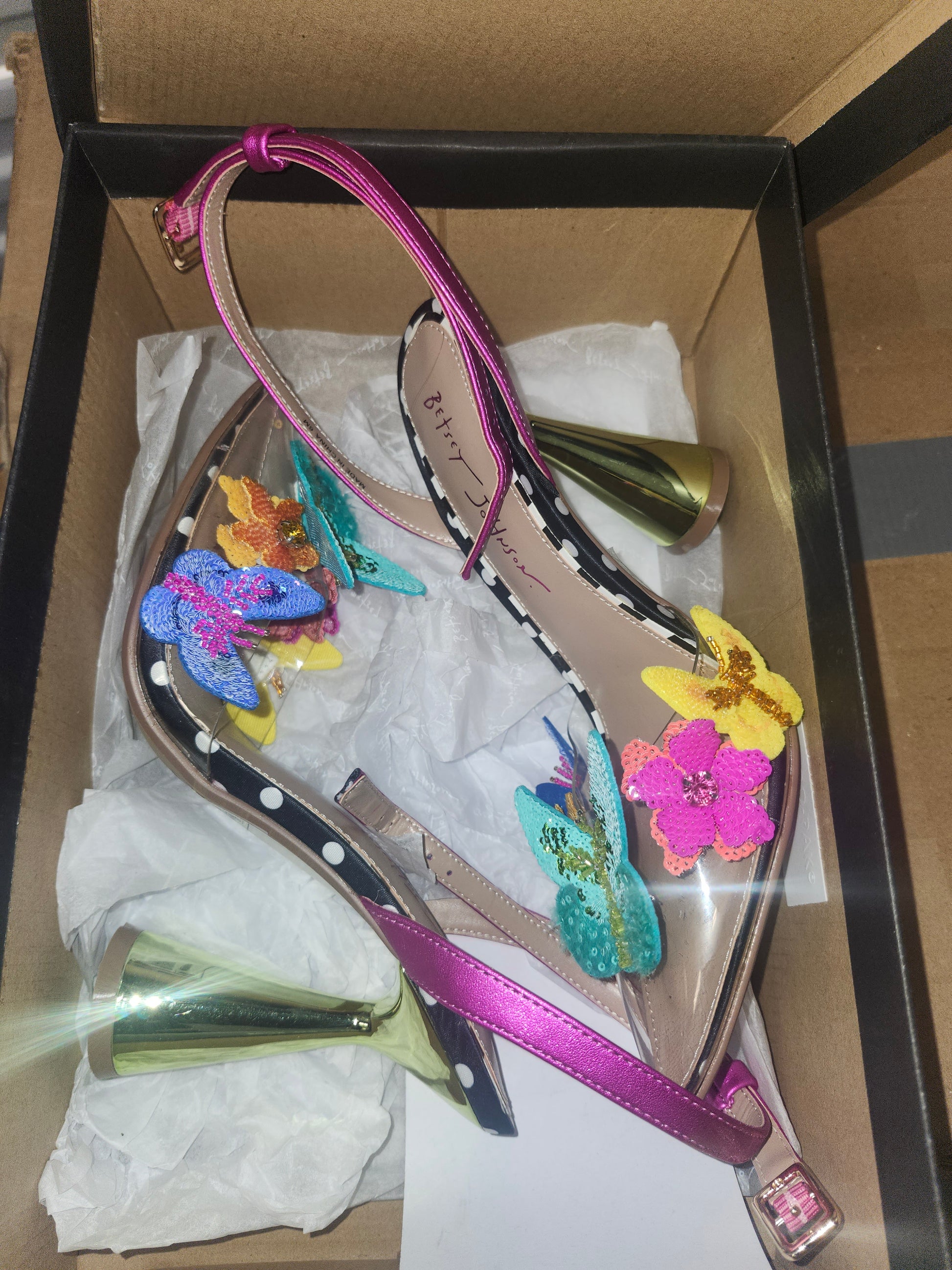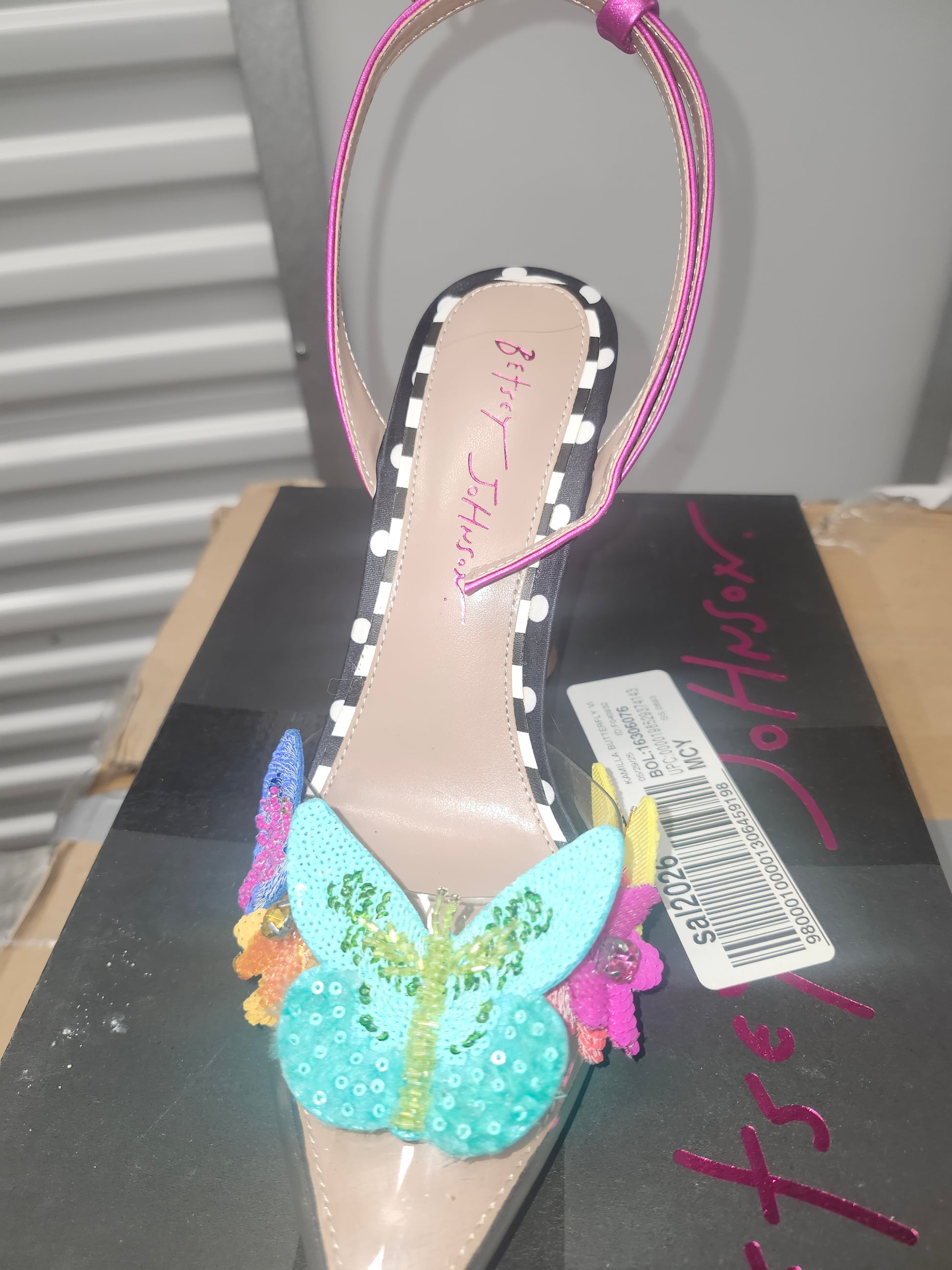 Elevate your style with the Betsey Johnson Kamilla Black Pump. This eye-catching shoe features a shiny synthetic upper adorned with a unique butterfly appliqué, an adjustable buckle strap for a perfect fit, and a comfortably cushioned footbed. Ideal for adding a whimsical touch to any outfit.