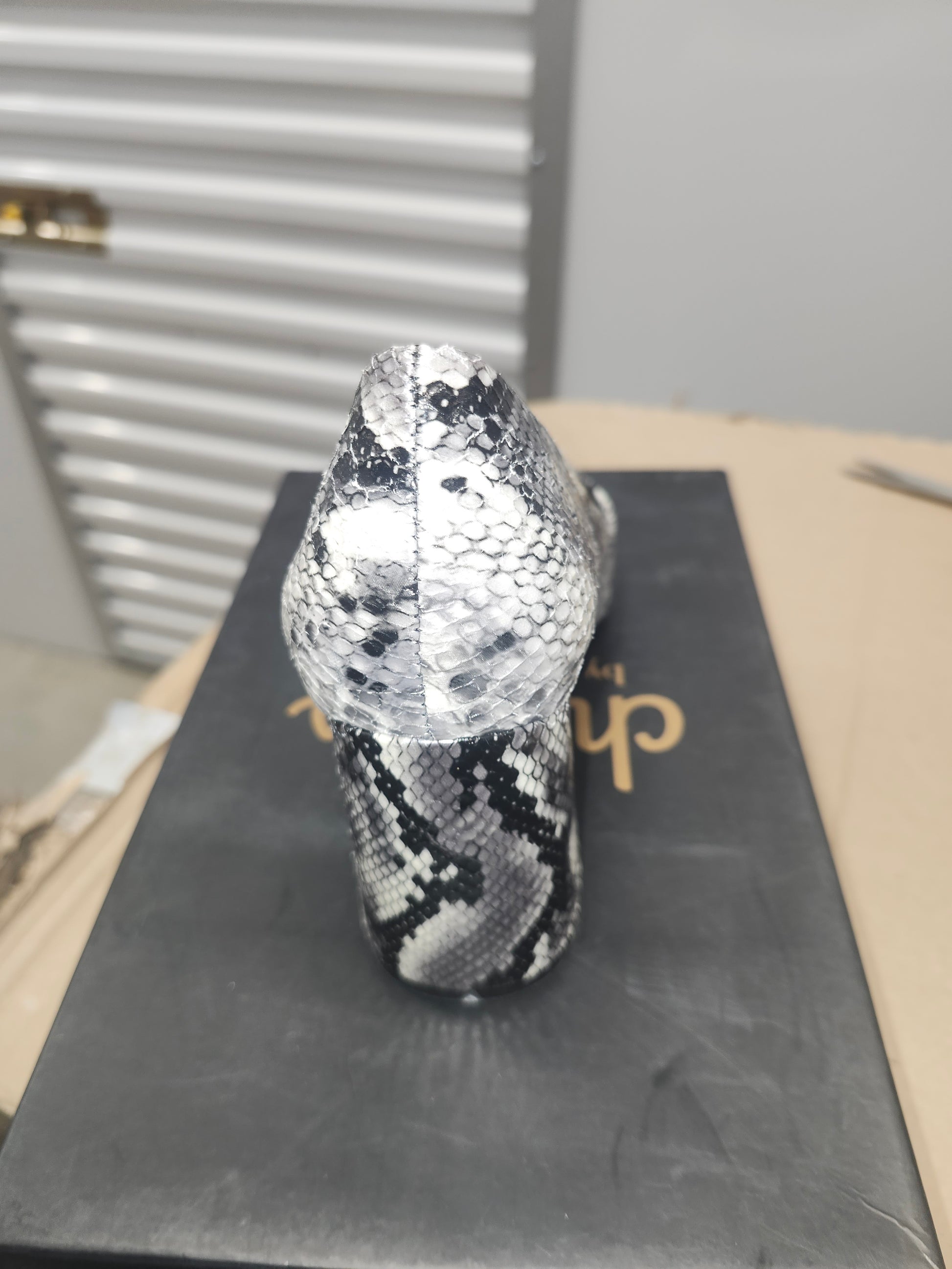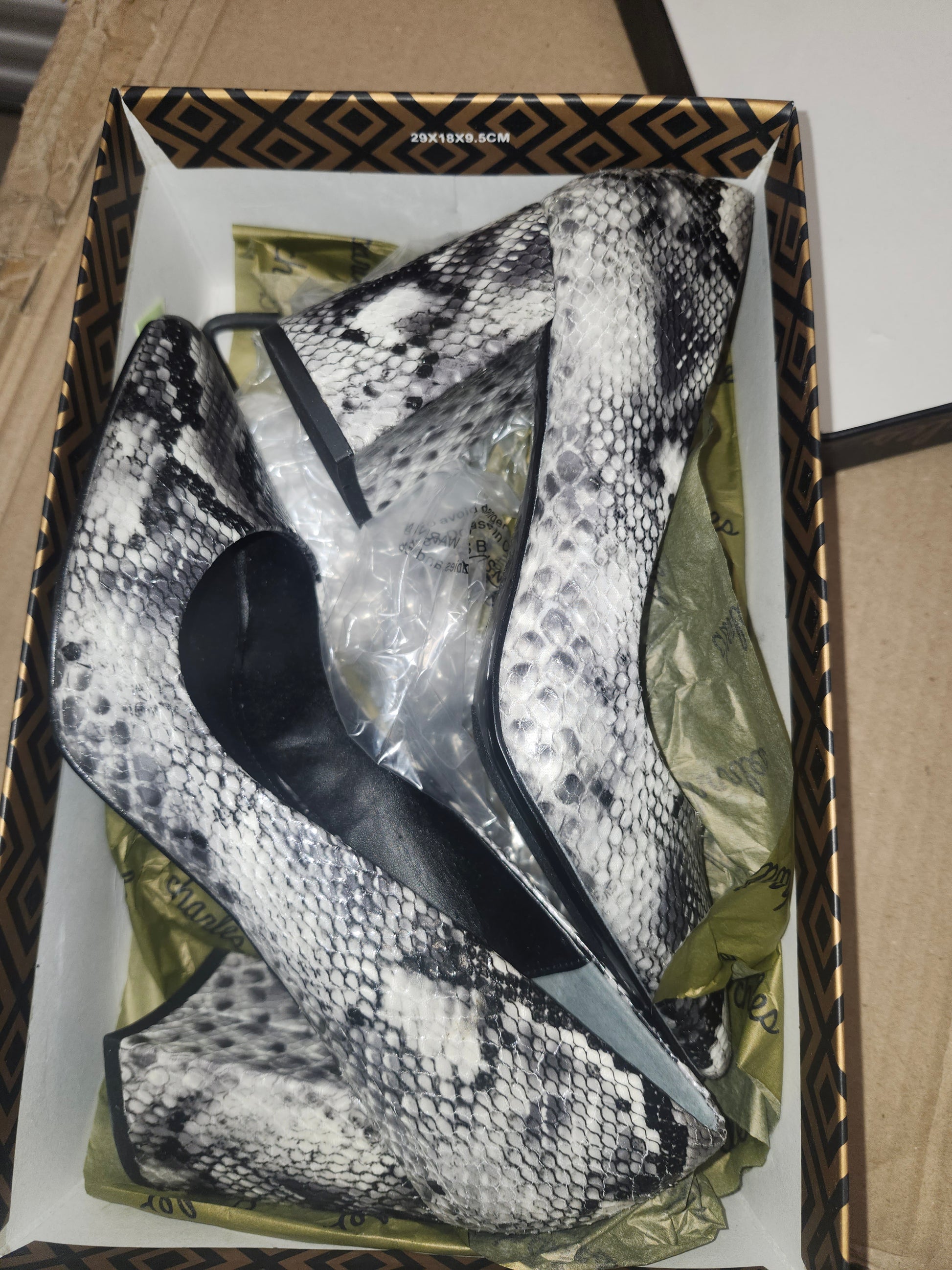 Elevate your style with the Charles by Charles David Verse Pump. This chic shoe features a glossy snake print fabric, a comfortable synthetic lining, and a sleek 3.3-inch heel. Perfect for any occasion, it's a must-have for your wardrobe.