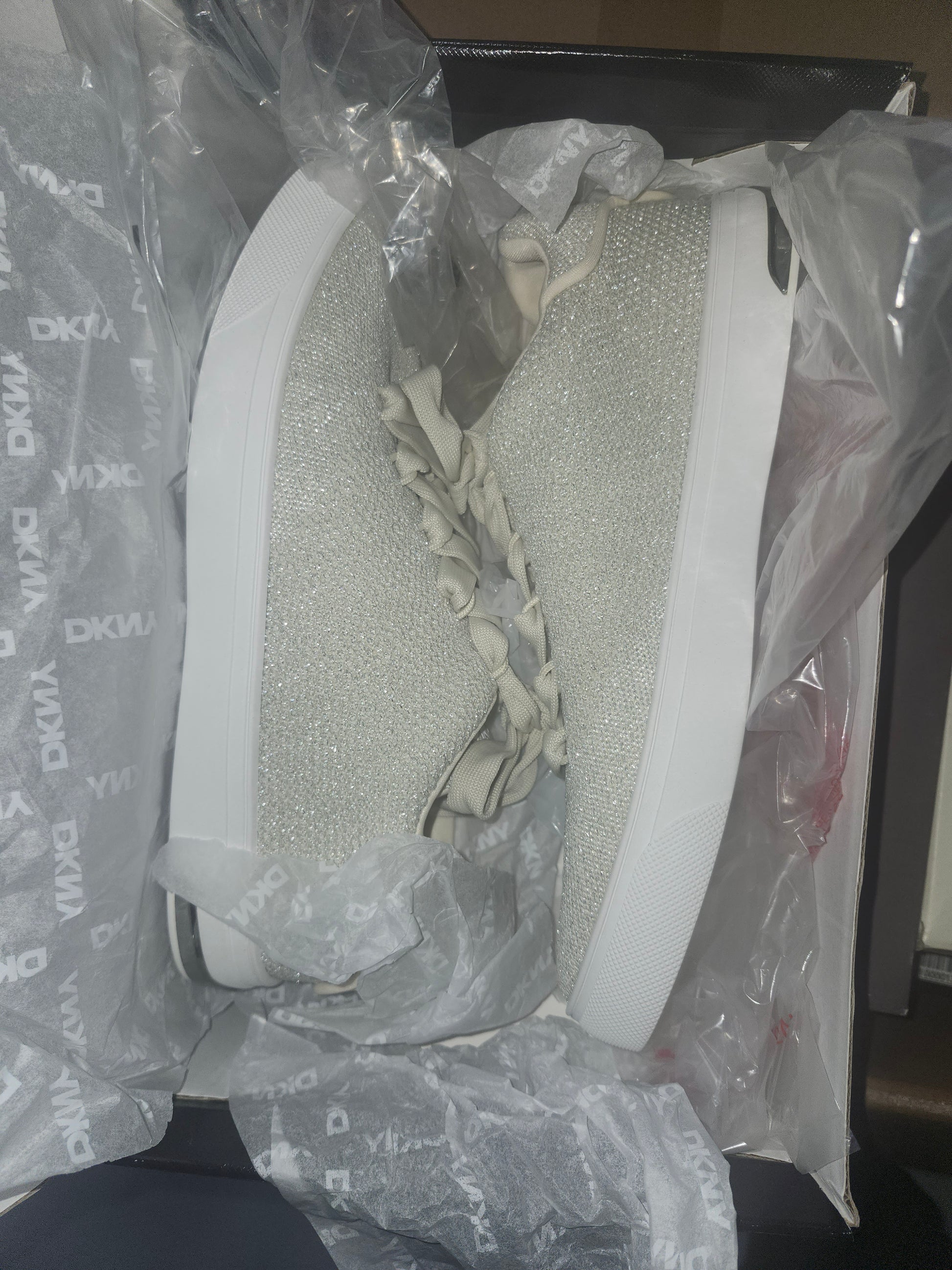 Elevate your casual style with the DKNY Abeni Lace-Up Low-Top Sneakers. Perfectly pairing with denim or linen, these sneakers offer a fresh, versatile look in a chic Bone/Silver color. Ideal for any outfit, step into comfort and style with size 8MUS.