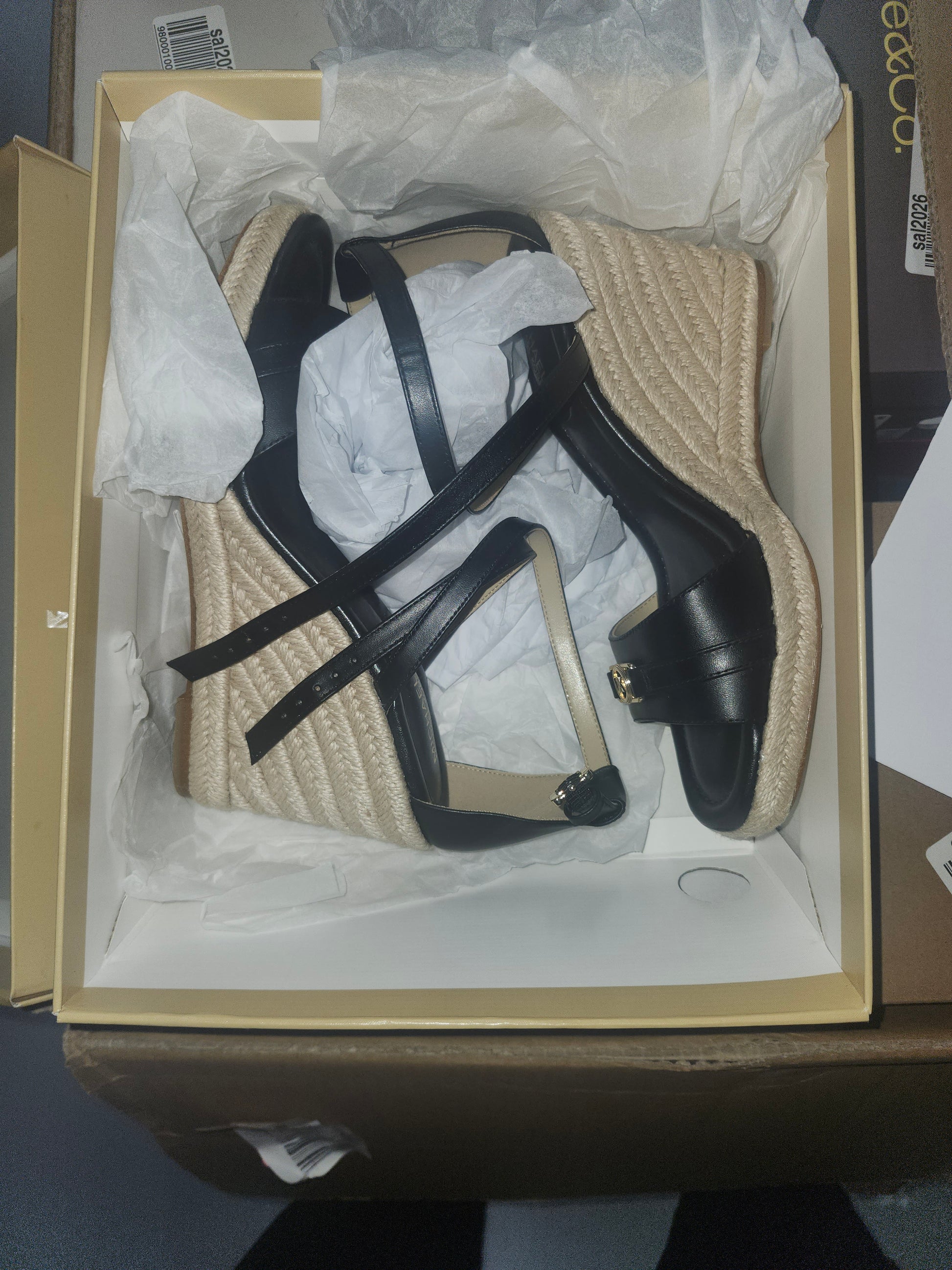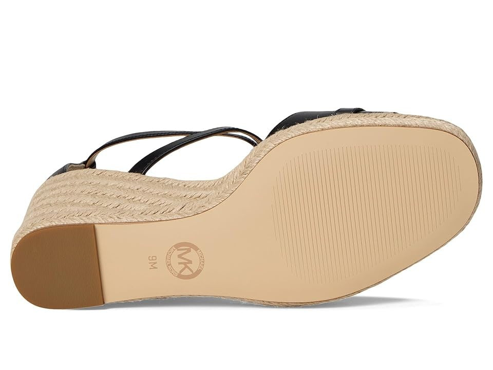 Elevate your style with the MICHAEL Michael Kors Mandy Wedge Sandals. These chic black leather sandals feature a jute wedge heel, cushioned footbed, and elegant strap detailing, perfect for everyday elegance. Ideal for any wardrobe!