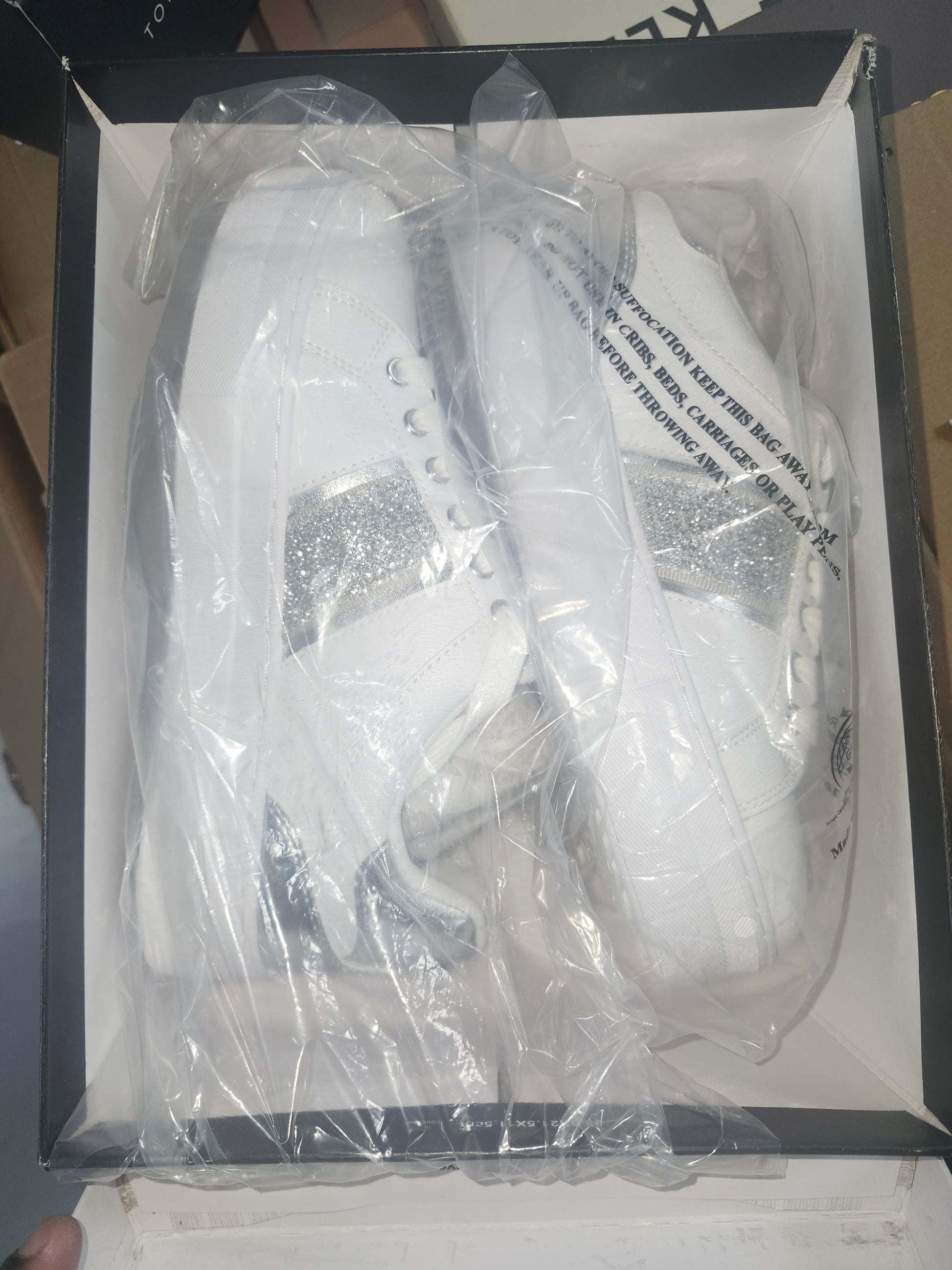 Elevate your casual style with the Nine West Gator Platform Sneaker. This chic white low-top features dazzling rhinestone details, adding a sparkle to every step. Perfect for those who love a touch of glamour in their everyday wear.